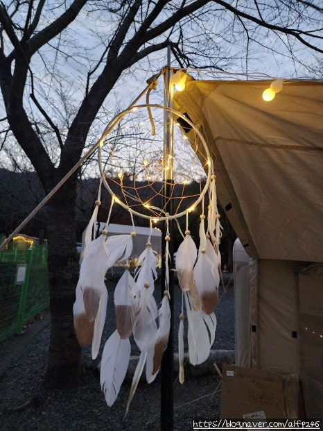 캠핑고래가서 샀던 조명 드림캐쳐도 달아서 켜주고
